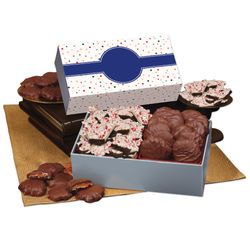 The perfect gift for the chocolate lovers on your list. Rich, mouthwatering Caramel Pecan Clusters made with chewy caramel, full-flavored Southern pecans, and premium chocolate come packed with our creamy and crunchy Peppermint Bark. The silver gift box comes wrapped with a sleeve decorated with a joyful array of multicolored bubbles and contains nine-ounces of the best chocolate ever! The sleeve features your imprint in one of six colors.